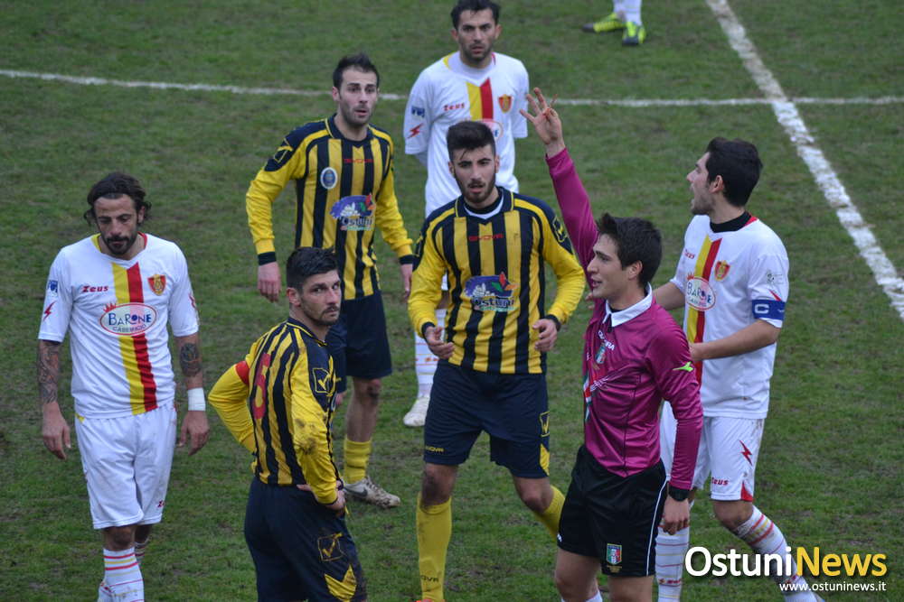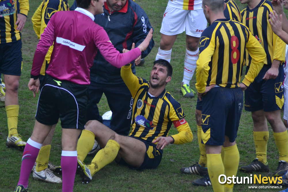 Al 39’ l’Ostuni resta in dieci uomini. Su un contrasto Tedesco allunga la mano sulla faccia di Camassa che cadendo scalcia il suo avversario. L’arbitro manda sotto la doccia il capitano dell’Ostuni, mentre grazia Tedesco con un semplice giallo.