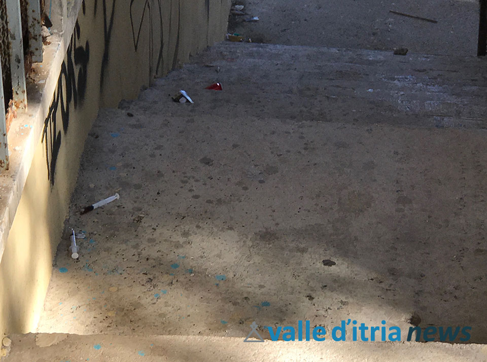 Tre siringhe abbandonate sotto le scale della scuola, nel piccolo parcheggio prima di entrare in villa. Gocce di sangue sparse. Villa Carmine assomiglia sempre più, purtroppo, ad un piccolo campo di battaglia, dove i frequentatori, sempre gli stessi, sempre di meno, devono ogni giorno combattere contro degrado e inciviltà. Le siringhe non sono le prime segnalate e fotografate (quelle nella foto qui sopra, risalgono a lunedì mattina).