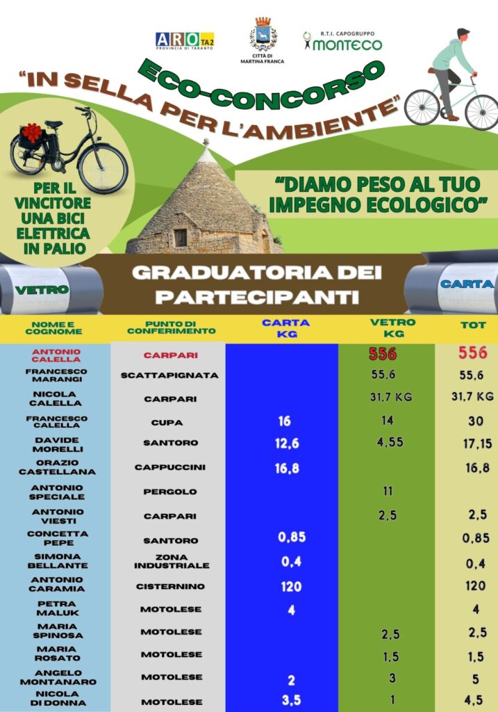 Al concorso hanno partecipato solo 16 persone, alcune delle quali, come si vede dalla classifica diffusa dal comune di Martina Franca, hanno conferito solo 850 grammi di carta.